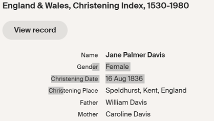 There is however a transcribed baptism of a child, Jane Palmer Davis on 10 August 1836. The given parents were William and Caroline Davis of Speldhurst near Tunbridge Wells in Kent.