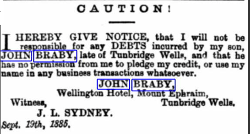 John Jr. married Florence Emma Benzie in 1880, the divorce papers state they had five children but only two alive in 1898. John was a Wine Merchant. The family moved around living in Tunbridge, Uxbridge Maidstone and the USA. There seems to have been a falling out within the family most likely because John has left the family and is co-habiting with an unknown woman in the USA. his father John has put a caution in the newspapers regarding any debts occurred by son John.
