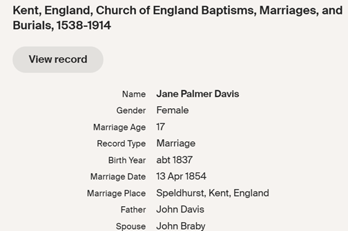 Jane married John Braby on 13 April 1854 in Speldhurst, Kent. Jane is close to 18 years of age and John is 21. Jane’s father is recorded as John Davis.