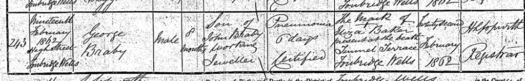 Tragically George died of Pneumonia on the 19th February 1862 aged 8 months. His death was registered by Eliza Baker who was present at death. Found in the 1861 census, Eliza Baker was a married woman living with her family at 7 Tunnel Terrace, Tunbridge Wells and occupation a Nurse.