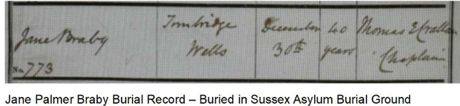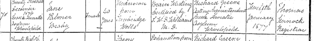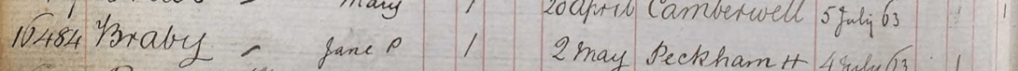 A few weeks after the birth of Mary, dated 2nd May 1863, I found an entry in the Lunacy register of a Jane P Braby admitted to Peckham House a private Asylum in Camberwell, London.