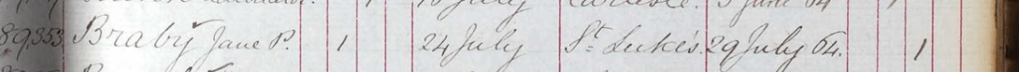 Three weeks later another entry is found in the Lunacy Register, Braby Jane P admitted on 24th July 1863 to St Lukes. She was discharged as not improved one year later 29th July 1864.