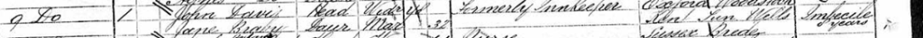 I cannot find any more information on Jane until the 1871 census when she is living with her widowed father John Davis in 9 Kensington Street in Tunbridge Wells. Her mother Caroline had died in 1864. John is now aged 78, a former Innkeeper, Jane aged 35, though her age is given as 32 on the census form. In the last column on the census form it states she has been an “Imbecile for 8 years”. This coincides with the admissions found in 1863 and following the birth of her daughter Mary.