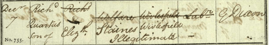In 1845, Elizabeth gives birth to another illegitimate son, Richard Quartus Stains, he is baptised in Wivelsfield on 7 December. The name Richard Welfare is crossed out.