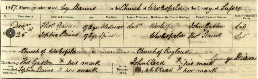 Disappointingly, although it showed she was married, it did not give her husband’s name only that she was the wife of a Labourer of Lindfield. The closest marriage that I found was that of a Sophia Stains who married a Thomas Gaston in Wivelsfield on Christmas Day in 1857.