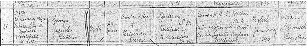 George’s Admission Record to Sussex Asylum describes him as a “Bootmaker, Formerly Pianoforte Tuner”, and gives his “Previous Place of Abode” as 2 Station Street, Portslade. (Why is this different from the address given on his father’s Census entry less than 3 weeks before, which was given as 2 The Drove, Portslade? Had they moved house in those 3 weeks?)
