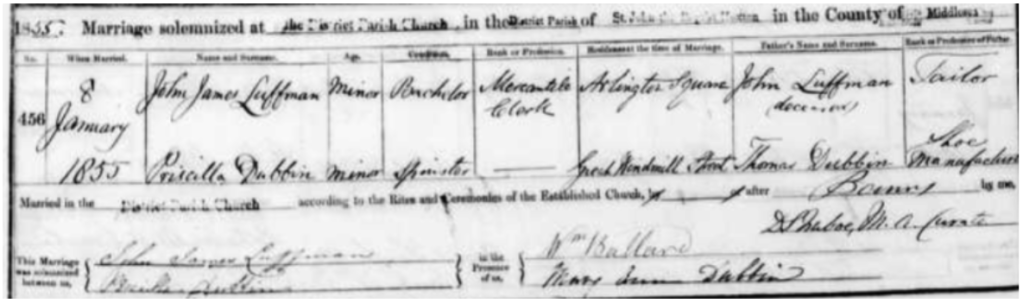 In 1851 Priscilla, a servant, was living with her sister Jane and husband. On 2nd May 1854, Priscilla baptised a son Frederick Eugene Dubbin in Brighton. No father was recorded. Sadly, Frederick’s death is registered in the second quarter of 1854. Priscilla went on to marry John James Luffman, a mercantile clerk, on 8th January 1855. Both were minors. By the time of the 1861 Census Priscilla was not with John J Luffman; instead she was living with John Cox, a younger man and brass finisher, in Deptford. Her age is given as 21, which was not correct as she was 27 years old. There is a death of a John Luffman in 1868, the same year that Priscilla marries John Cox, so I am assuming that Luffman’s death is correct.