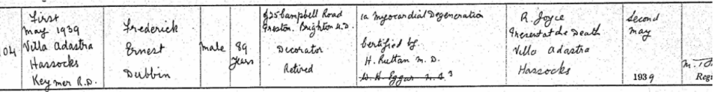 Frederick died aged 89 while in a Salvation Army nursing home, The Villa Adastra, Hassocks Cuckfield. The cause of death was listed as myocardial degeneration (degeneration of the heart tissue.)